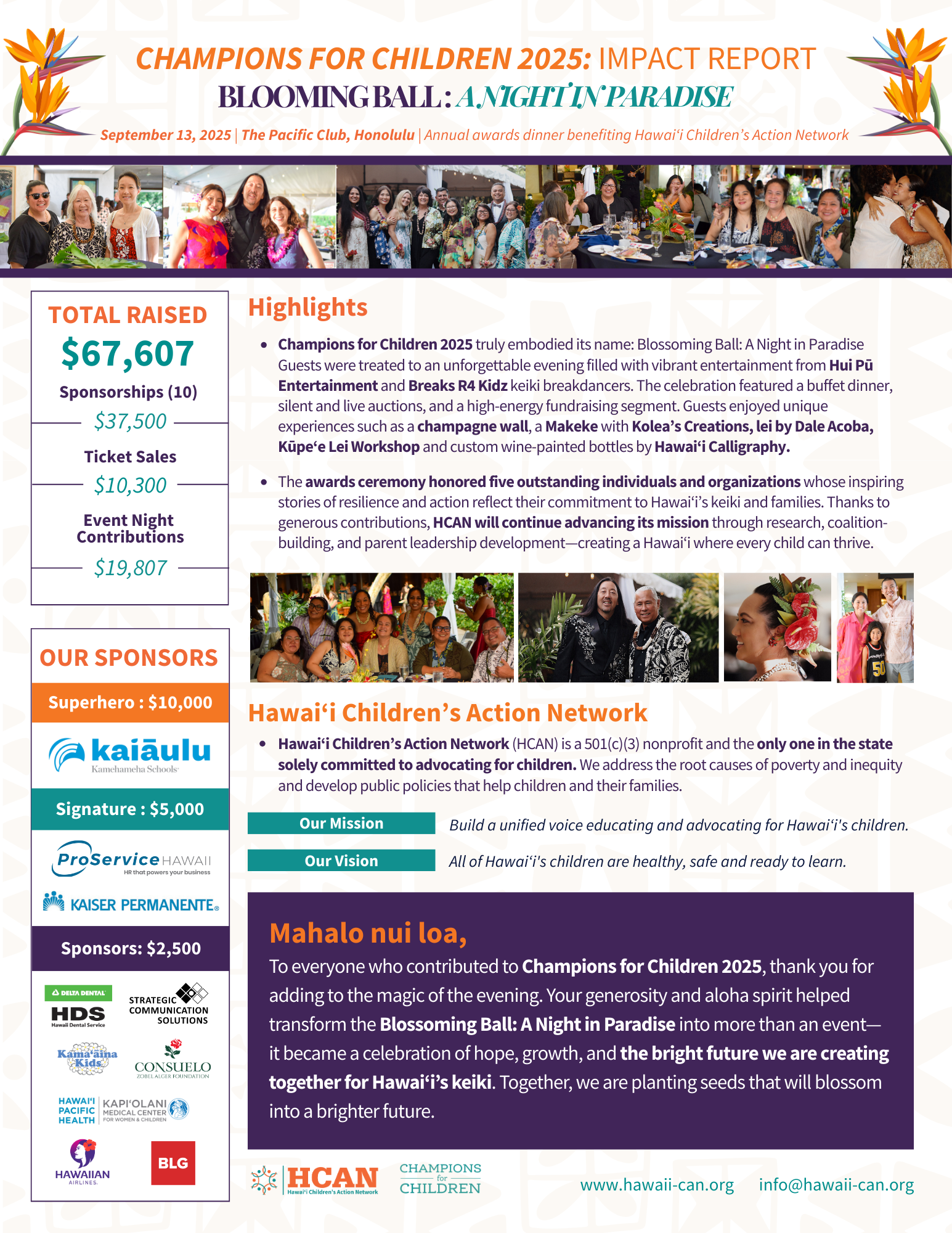 To everyone who contributed to Champions for Children 2025, your generosity and aloha spirit made the evening truly magical. Because of you, we raised an incredible $67,707! Together, we transformed the Blossoming Ball: A Night in Paradise into more than an event—it became a celebration of hope, growth, and the bright future we are creating for Hawaiʻi’s keiki. Your support is planting seeds that will blossom into opportunities and brighter tomorrows for our children.