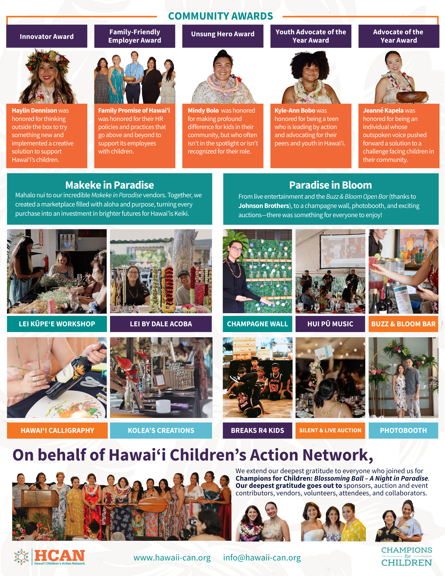 Champions for Children 2025 truly embodied its name: Blossoming Ball: A Night in Paradise Guests were treated to an unforgettable evening filled with vibrant entertainment from Hui Pū Entertainment and Breaks R4 Kidz keiki breakdancers. The celebration featured a buffet dinner, silent and live auctions, and a high-energy fundraising segment. Guests enjoyed unique experiences such as a champagne wall, a Makeke with Kolea’s Creations, lei by Dale Acoba, Kūpeʻe Lei Workshop and custom wine-painted bottles by Hawai‘i Calligraphy. The awards ceremony honored five outstanding individuals and organizations whose inspiring stories of resilience and action reflect their commitment to Hawai‘i’s keiki and families.